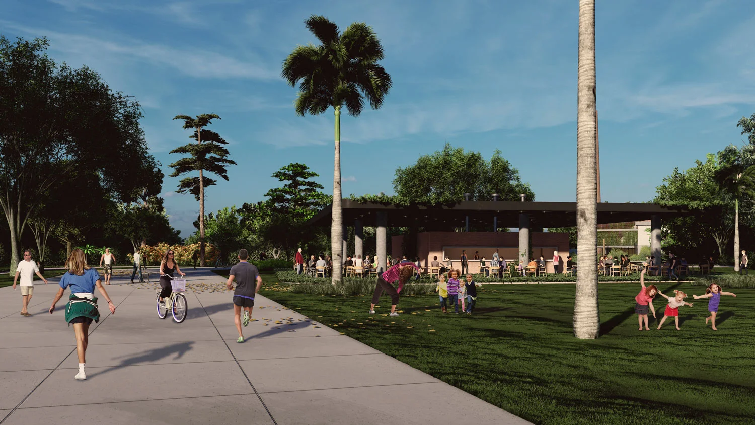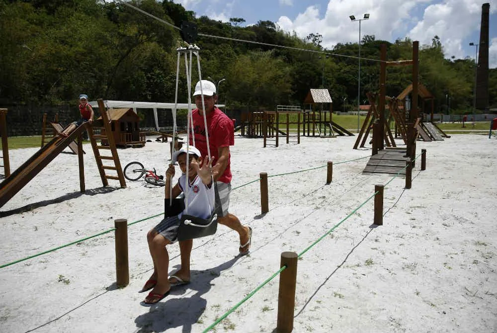 O parque também tem estrutura de convivência: praças de alimentação, banheiros públicos e espaços infantis, o que o torna